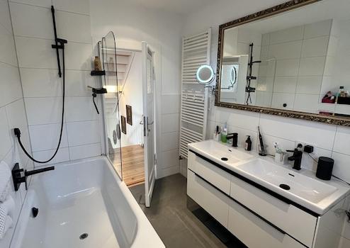 - Aufwertung der Bäder durch, Glasduschabtrennungen, neuen Doppel-Waschtisch mit Unterschrank (Villeroy & Boch) sowie vollständige Erneuerung sämtlicher Armaturen