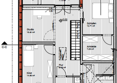 OG: Schlafen, Ankleiden, Spielen, Studio: Spielen/Arbeiten, Haustechnik, großes Bad sowie Zugang zur Loggia