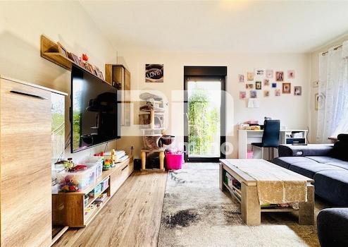 Herzstück der Wohneinheit ist das lichtdurchflutete Wohn-/Esszimmer mit großen Fensterfronten und direktem Zugang zur gepflasterten Sonnenterrasse (Sondernutzungsrecht).