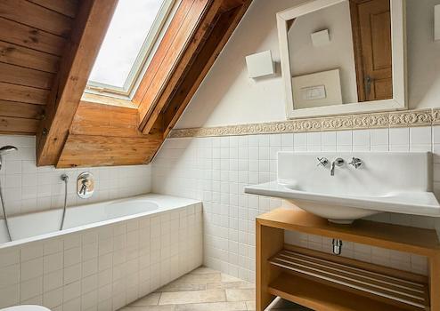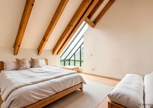 Im Dachgeschoss befinden sich drei Schlafräume und zwei Bäder - eines en suite am Elternschlafraum und ein Zweitbad für die beiden Kinderzimmer.