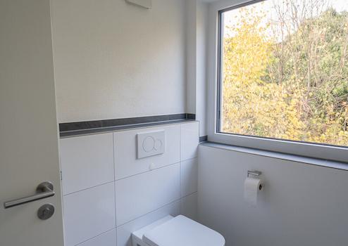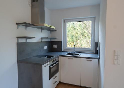 * großformatige Fliesen (Farbe: Anthrazit) in der Küche und im Badezimmer
