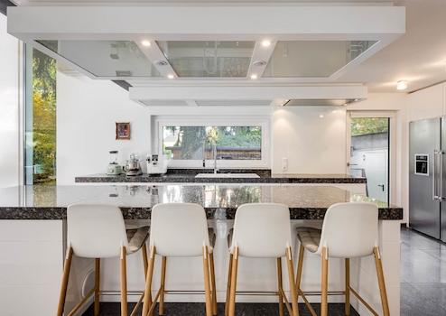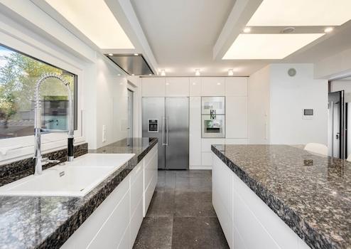 - Hochwertige Einbauküche mit mattweißen grifflosen Fronten, Granit-Arbeitsflächen (Baltic Brown) und Arbeits-/Essinsel samt indirekter und Spot-Beleuchtung und vier Hochstühlen, ausgestattet mit breitem Flächen-Induktionskochfeld und deckenintegriertem Dunstabzug (beides Novy), Backofen, Dampfgarer (beides Gaggenau), Side-by-Side Kühl-Gefrier-Kombination mit Icemaker (Liebherr), Geschirrspüler (Miele), Porzellanspülbecken samt Gastro-Armatur und Apotheker-Vorratsschrank