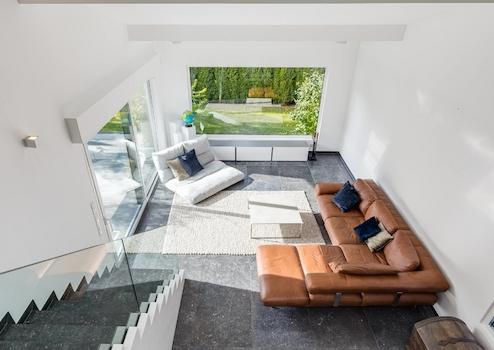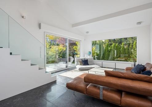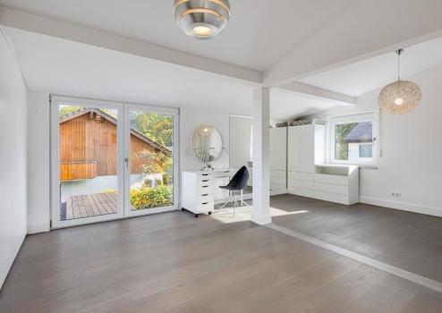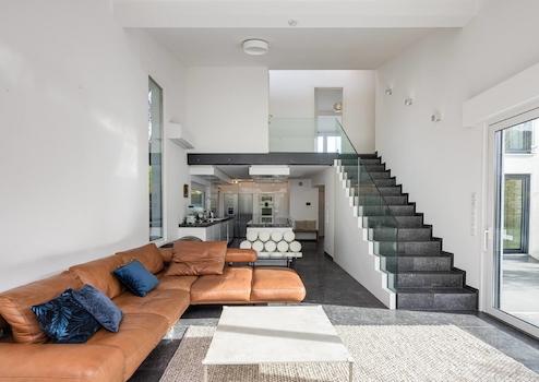 Von den Feinstein- und Eichen-Dielenböden über die Küche bis hin zur Badgestaltung wurde großes Augenmerk auf eine hohe Qualität gelegt. Klimaanlagen auf beiden Wohngeschossen, ein Soundsystem und ein Sicherheitskonzept sind ebenfalls Teil der Ausstattung. So entstand ein äußerst detailreiches, perfekt durchdachtes Zuhause, das dank großflächiger Glasfronten und der idealen Hauptausrichtung nach Süden und Westen von morgens bis abends ein Maximum an Licht und Sonne erhält.
