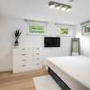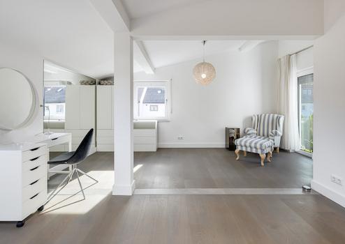 - Maßeinbauten mit mattweißen Fronten im Obergeschoss