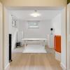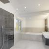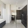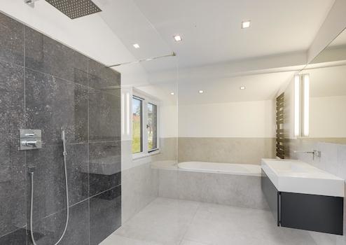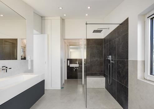 - Helles Masterbad en suite, gestaltet mit großformatigem Feinstein in authentischer Naturstein-Optik, putzbündig verlegt, ausgestattet mit XXL-Wanne (Hoesch), bodengleicher Rainshower-Dusche samt Sitzbank, breitem Waschtisch samt Unterschrank, Keuco-Unterputzarmaturen, beleuchtetem Spiegel, Handtuchwärmer, Deckenstrahler und weißem Einbauschrank mit Innenbeleuchtung; separate WC-Kabine mit Fenster, unterteilt durch Glas-Schiebetür