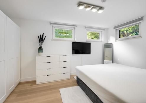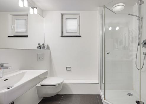 - Zusätzliches Duschbad im Souterrain mit oberirdischem Fenster, ausgestattet mit Glas-Eckdusche, Waschbecken, beleuchtetem Spiegel, WC und Handtuchwärmer
