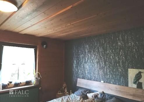 Zurück im Flur gehen Sie direkt zu den privaten Räume des Hauses befinden. Hier finden Sie zwei Schlafzimmer, die flexibel genutzt werden können – sei es als Kinderzimmer, Arbeitszimmer oder Gästezimmer. Die Zimmer sind gut geschnitten und bieten ausreichend Platz für individuelle Gestaltungsmöglichkeiten. Das Hauptschlafzimmer ist besonders gemütlich und hebt den Charme des Holzhauses recht hervor durch die originelle Holzdecke die verbaut ist.