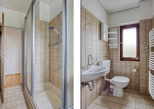 Die beiden Duschbäder in den Etagen sind braun beziehungsweise türkis/grau gefliest und verfügen jeweils über Fenster.