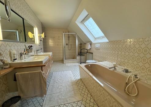 Repräsentatives, gepflegtes Wohnhaus mit Doppelgarage und großem Wellnessbereich in bevorzugter Lage. Das große Grundstück mit schönem Garten in Süd-Westausrichtung ist mit einem Sichtschutzzaun vor fremden Blicken geschützt. Insgesamt bietet das Haus absolut gehobenen Wohnkomfort, verteilt auf das Erdgeschoss mit großzügigem Wohn-Essbereich mit Kamin, verglaster Terrasse, Küche mit Einbauküche, Arbeitszimmer, Flur mit Garderobe, Gäste WC, Hauswirtschaftsraum und einem separaten Bereich mit Schlafzimmer und Bad mit Wanne, Dusche und WC. Im Dachgeschoss befinden sich ein Schlafbereich mit Ankleide, überdachtem Balkon und Bad mit Wanne, Dusche, Bidet und WC, Abstellraum sowie zwei Kinderzimmer mit Balkon und eigenem Duschbad mit WC.