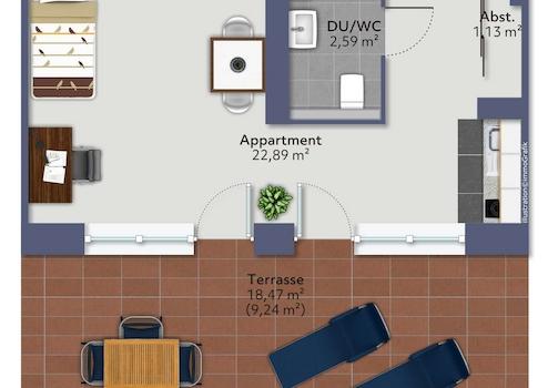 Beim Betreten der Wohnung empfängt Sie ein heller Eingangsbereich mit praktischer Abstellnische und Garderobe. Das Badezimmer ist modern gefliest und verfügt über eine Dusche sowie einen Handtuchheizkörper. Anschließend öffnet sich der Wohn- und Schlafbereich mit einer kompakten Einbauküche, die mit Kühlschrank, Mikrowelle und zusätzlichen Abstellmöglichkeiten ausgestattet ist. Der Hauptraum bietet ein Bett, einen Schreibtisch und einen Kleiderschrank und überzeugt durch große Fensterfronten, die viel Tageslicht hereinlassen und den direkten Zugang zur beeindruckenden Dachterrasse ermöglichen – der perfekte Ort zum Entspannen oder Lernen an der frischen Luft.