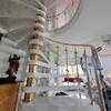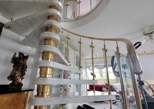 Nach Betreten der Wohnung befinden Sie sich direkt in einem großen, offenen Wohn-/Ess-/Kochbereich, der auffällig hell und gemütlich ist. Viele Fenster, eine verglaste Raumecke und eine hochwertige und praktische Küche laden zum Verweilen ein. Im Anschluss finden Sie ein Gäste-WC, ein Büro und einen kleinen Abstellraum. Direkt vom Wohnraum aus, gelangen Sie über eine massive Marmortreppe in das obere Stockwerk.