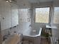 * modernes Bad mit Wanne, weiße Boden- und Wandfliesen, großes Fenster