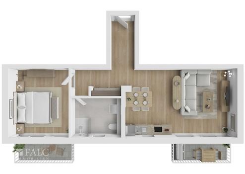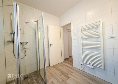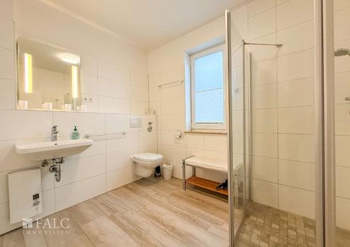 Fließend schließt sich das Schlafzimmer an, das mit seinem eigenen Zugang zum Balkon einen privaten Rückzugsort schafft. Hier lässt sich mühelos eine kleine Sitzecke einrichten, um den Tag mit einem Buch oder einer Tasse Tee in Ruhe ausklingen zu lassen. Das Badezimmer überzeugt mit einer modernen Gestaltung, einer ebenerdigen Dusche und einem Fenster, das für angenehmes Tageslicht sorgt – stilvoll, funktional und hell.