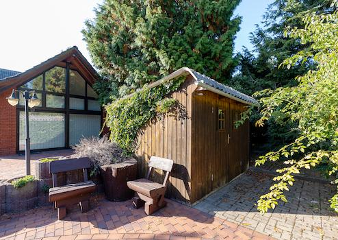 Der Garten ist ein Ort zum Verweilen. Die große, uneinsehbare Grünfläche eröffnet zahlreiche Gestaltungsoptionen – von blühenden Beeten über Gemüseanbau bis hin zu Spiel- und Rückzugsflächen für die ganze Familie. Ein Gartenhaus nebst Schuppen und Geräteraum fügen sich harmonisch in das Grundstück ein und bieten praktischen Stauraum für Fahrräder, Geräte und alles, was man im Alltag gerne griffbereit hat.