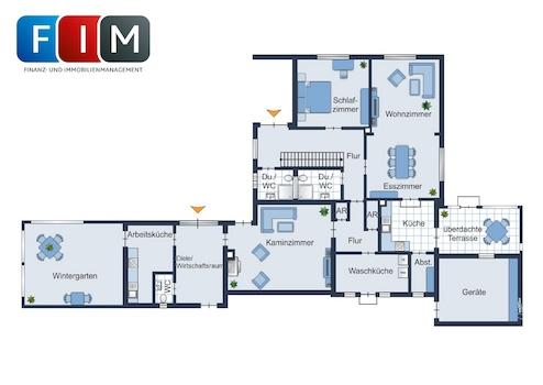 Ein großzügiger Eingangsbereich führt Sie in die helle Diele, von der aus sich das Haus öffnet. Der weitläufige Wohn- und Essbereich bietet viel Platz für gemütliche Stunden und geselliges Beisammensein. Die Küche liegt in direkter Nähe zur überdachten Terrasse. Ein Schlafzimmer, zwei Duschbäder, eine Waschküche sowie mehrere Abstellräume ergänzen das Raumangebot auf dieser Ebene. Ein besonderes Highlight ist das große Kaminzimmer, das als Rückzugsort oder zusätzlicher Wohnraum genutzt werden kann.
