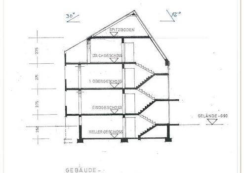 Architektonisches Highlight ist die asymmetrisch angelegte Dachform, mit steilem Dach von 56° auf der Ostseite, und nur 30° steilem Dach auf der Westseite. Dadurch beeinträchtigen die Dachschrägen das Möblieren in den Räumen auf der Ostseite (Schlafzimmer, kleines Zimmer, Küche, Bad) kaum, und auf der Westseite, auf der sich das Wohnzimmer befindet, gibt es gar keine Schrägen. Denn hier wurde das Wohnzimmer zurückversetzt, und im flacheren Dachbereich davor entstand die sehr gut nutzbare, ca. 13 m² große Dachterrasse. Zum besseren Verständnis enthält unser Exposé nicht nur den Grundriss, sondern auch den Schnitt durch das Gebäude.