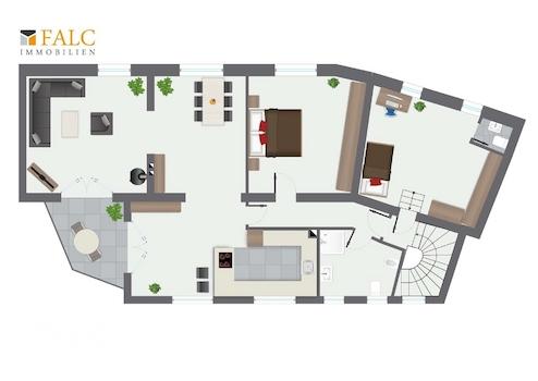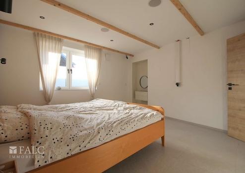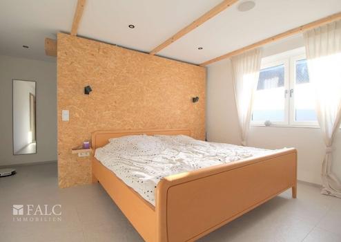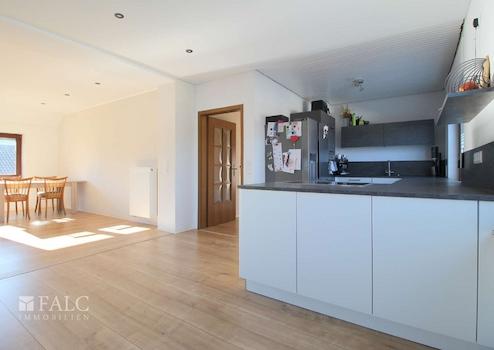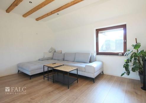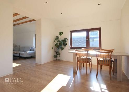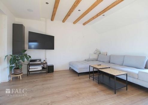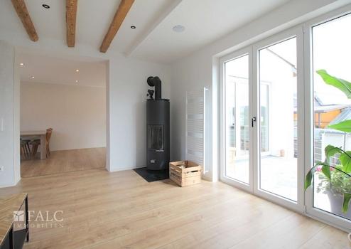 Besonders das Wohnzimmer im 1. Obergeschoss mit seinen sichtbaren Holzbalken und dem modernen Kamin lädt zum Entspannen ein. Die offene Küche auf dieser Etage ist ein Highlight für alle, die gerne kochen und Zeit mit der Familie verbringen. Sie bietet viel Platz und ist mit modernen Geräten ausgestattet. Direkt angrenzend befindet sich das Esszimmer sowie der Balkon mit Blick ins Grüne. Zwei Schlafzimmer ergänzen diese Wohneinheit mit ca. 125 m² Wohnfläche. Das Badezimmer ist modern gestaltet und ist mit einer Dusche ausgestattet.