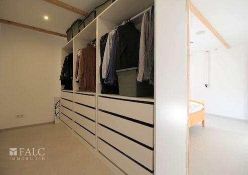 Die Einheit im Erdgeschoss mit ca. 65 m² Wohnfläche teilt sich in zwei Zimmer, Küche und ein Badezimmer mit Badewanne auf. Das Badezimmer im Ergeschoss ist noch nicht vollständig fertiggestellt. Der Waschtisch muss noch installiert werden. Das jetzige Schlafzimmer inkludiert einen Ankleidebereich.