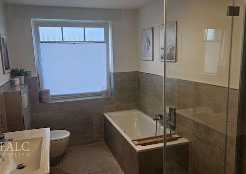 Im Eingangsbereich befindet sich das moderne Gäste-WC. Die Diele führt Sie weiter in die schicke Einbauküche und in das im Jahr 2021 modernisierte Badezimmer mit Wannenbad und Walk-In Dusche. Linksseitig des Flures befindet sich das geräumige Schlaf- und Ankleidezimmer.