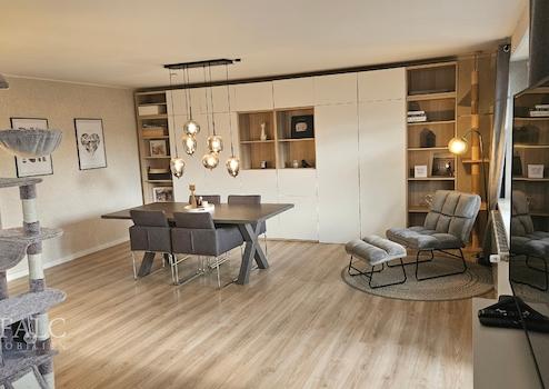 Nach einem weiteren rechtsseitig gelegenem Zimmer, erreichen Sie den großen, warmen Wohn-/ Esszimmerbereich mit Zugang zur Terrasse und einem nicht einsehbaren Garten.