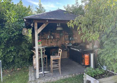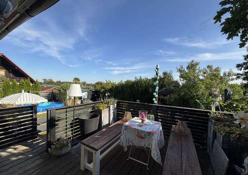 Ein besonderes Highlight ist die große Südterrasse aus Holz, welche sich im Sommer zum Mittelpunkt des familiären Zusammenseins entwickelt. Hier genießen Sie sonnige Stunden mit Blick in den traumhaften Garten – sei es beim Frühstück im Freien, beim Grillabend mit Freunden oder einfach beim Entspannen nach einem langen Tag. Der liebevoll angelegte Garten ist eine grüne Oase, in der Sie Ihren Feierabend genießen oder Kinder ungestört spielen lassen können. Der untere Teil des Grundstücks bietet zudem noch viel ungenutztes Potenzial zur individuellen Gestaltung.