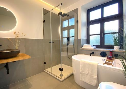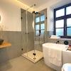 - Bad mit Dusch, Badewanne, Handtuchheizkörper, Hansgrohe Armaturen und Tageslicht