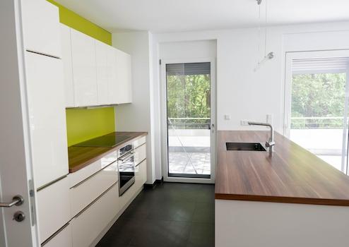 Wunderschöne helle sonnige Neubauwohnung modern mit großen Fenstern auch im großen Badezimmer mit Wanne und Dusche direkt am Wald. Schöne offen Einbauküche und Kamin im Wohnzimmer. Extra Gästetoilette und großen Einbauschrank im Gang. Großes Kellerabteil und Gemeinschaftswaschraum für die Waschmaschine.