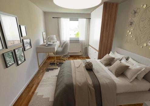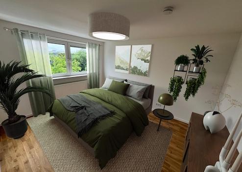 Nach dem Bad ebenfalls auf der linken Seite befindet sich die Küche, danach geht´s geradeaus ins Schlafzimmer. Gegenüber der Küche, auf der rechten Seite des Flures befindet sich der große Wohn-Essbereich. Vom Wohnzimmer aus gelangen Sie auf den 10qm-großen Balkon, der genau nach Westen ausgerichtet ist und auf dem sich perfekt die Abendsonne genießen lässt. Rechts vom Eingang befinden sich die beiden Kinderzimmer, die sich natürlich alternativ auch als Ankleidezimmer oder Homeoffice nutzen lassen. Die hervorragend geschnittene Wohnung eignet sich bestens für eine Familie mit ein oder zwei Kindern oder selbstverständlich auch für ein Pärchen, das einfach etwas großzügiger leben will.