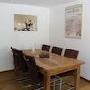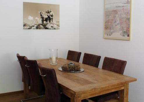 Das lichtdurchflutete Wohnzimmer mit seiner breiten Fensterfront beinhaltet eine Eckcouch mit zwei Schlafplätzen, einen großen Klostertisch aus massivem Eichenaltholz mit 6 Stühlen, einer dazu passenden Anrichte aus Altholz, sowie einen Bauernschrank.
