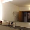 Das Bad bietet eine große Regenwalddusche, ein Waschbecken mit schönem Unterbau, ein großer Spiegel mit integrierter Beleuchtung, ein Einbauschrank mit Stauraum und Waschmaschinenanschluß.