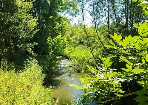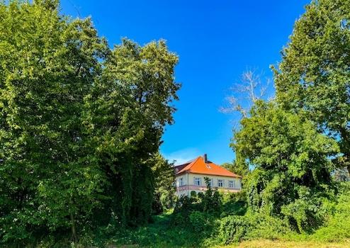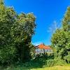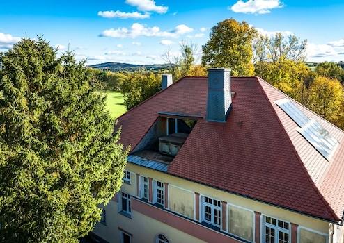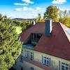 Wir haben hier die Villa vom benachbarten Wohn- und Gewerbepark abgetrennt - gern können Sie diesen aber auch mit erwerben. Da reden wir inkl. Wald, Wiese und Flüsschen von etwa acht Hektar Land im Außenbereich (davon fast drei Hektar Bauland) und Baukörpern mit einer Kubatur von etwa 30.000 m³ - siehe Luftbild.