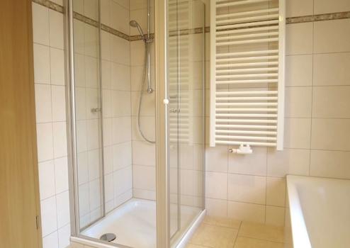 Das schicke, hochwertig ausgestattete modernisierte Badezimmer verfügt über eine Badewanne, einen beheizbaren Handtuchhalter, eine Dusche mit Glaskabine, ein Waschbecken mit modernen Badezimmerschränken. Hier wurden moderne, helle Wand- und Bodenfliesen verwendet. Ein großes Fenster bietet Ihnen reichlich Tageslicht.