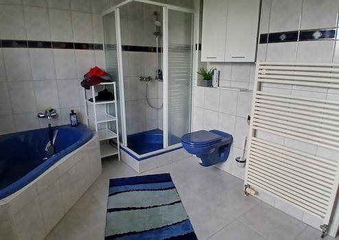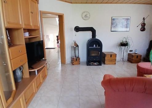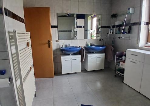 Im Erdgeschoss befinden sich eine große Wohnküche, ein Schlafzimmer, ein Wohnzimmer mit Kaminofen, ein Büro/Kinderzimmer, ein großes Bad mit Eckbadewanne und Dusche sowie ein Gäste-WC.
