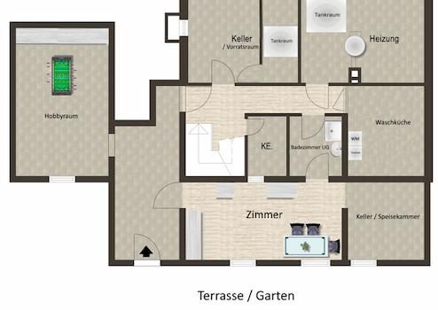 Auch die Garage mit ihrer Unterkellerung ist ein Highlight, da hier ein großer, praktischer Hobbyraum entstanden ist, in dem sich sogar Platz für eine Tischtennisplatte findet! Im Untergeschoss haben Sie direkten Zugang zu diesem Raum.