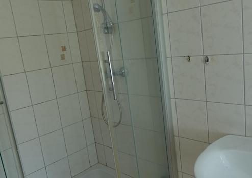 Will man in die Wohnung und man hat die Holztreppe gemeistert (was eine ältere Dame über 10 Jahre täglich sehr gut gelang), erreicht man über das Treppenhaus als erstes den Wohnungsflur. Von hier sind alle Räume zugänglich, also keine Durchgangszimmer. Ganz links ist das Wohnzimmer. Es ist circa so groß wie der ganz rechte Raum, das Schlafzimmer. Selbstverständlich kann man die Nutzung der beiden Zimmer tauschen. Der zweite Raum von links ist die Küche, daneben das Duschbad.