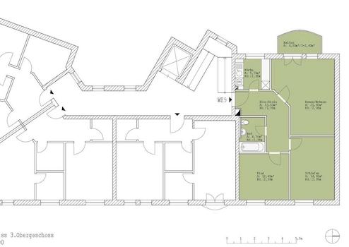 Wohnung und Keller sind bequem mit einem großen Aufzug erreichbar. Die Wohnung hat ein großes Wohnzimmer mit Balkon zum Hof sowie 2 kleinere Zimmer zur Straße. Alle Fenster der Wohnung sind mit Rollläden versehen.