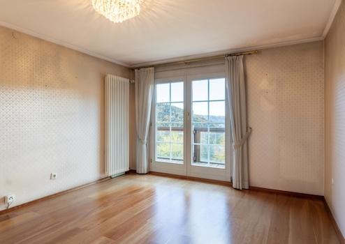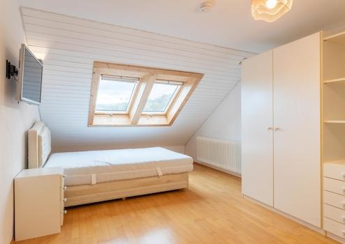 Die rechte und ältere Wohneinheit der Immobilie, mit eigenem Eingang neben der Garage, befindet sich im gepflegten Zustand der 1980er/90er-Jahre und bietet viel Potenzial für eine umfassende Modernisierung. Sie verfügt über ein Wohn- und Schlafzimmer, ein kleines Bad. Eine offene, sonnige nach Westen ausgerichtete Terrasse und ein Süd-Balkon (Baujahr ca. 1990), der vom Wohnzimmer aus zugänglich ist, runden diesen Gebäudeteil ab.