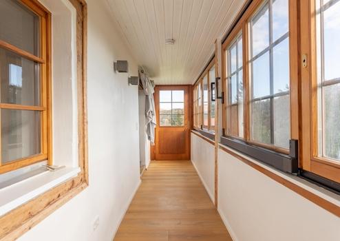 Der neue, sanierte Wohnbereich umfasst ein offenes Wohnzimmer, eine Küche, Flur und über zwei Treppen gelangt man ins Dachgeschoss mit 2 Schlafzimmern und zwei Bädern. Vom Wohnzimmer aus gelangt man auf eine verglaste Laube/Balkon mit schönem Blick ins Grüne. Der Keller (Haus ist teilunterkellert) beherbergt die Heizungsanlage, einen Lagerraum sowie einen überdachten Sitzplatz im Außenbereich.