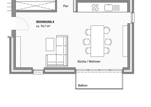 - Offener Wohn‑/Essbereich (Südausrichtung) mit Balkon/Terrasse