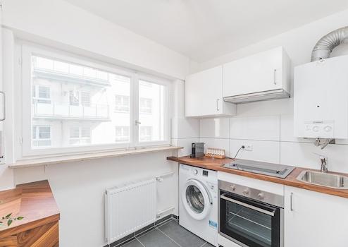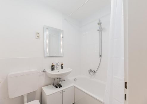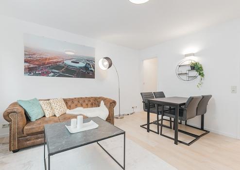 Jede Wohnung verfügt über eine Einbauküche mit Waschmaschine, einen sonnigen Balkon, ein gemütliches Schlafzimmer mit Doppelbett sowie einen praktischen Arbeitsplatz. Im stilvoll eingerichteten Wohnzimmer erwarten Sie ein elegantes Chesterfield-Sofa, ein Essbereich sowie ein Flachbildfernseher mit Netflix, Kabelfernsehen und schnellem Internet.