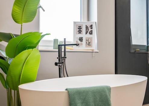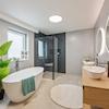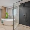 Das luxuriöse Badezimmer mit freistehender Badewanne, Walk-in-Dusche und Design-Elementen macht jeden Tag zum kleinen Wellness-Ritual.