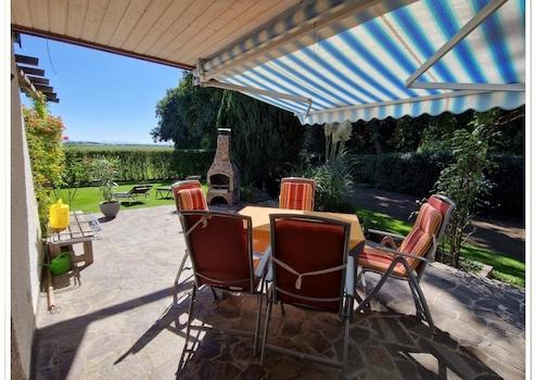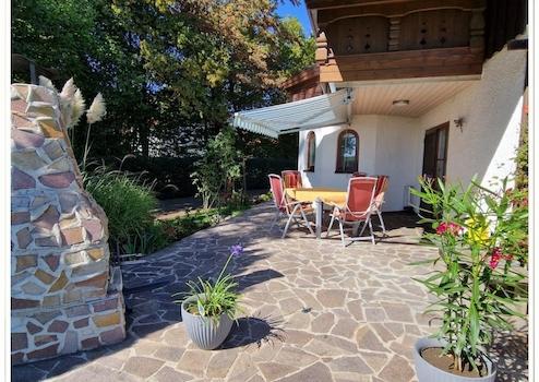 Großteils überdachte Terrasse in Südwest-Ausrichtung;