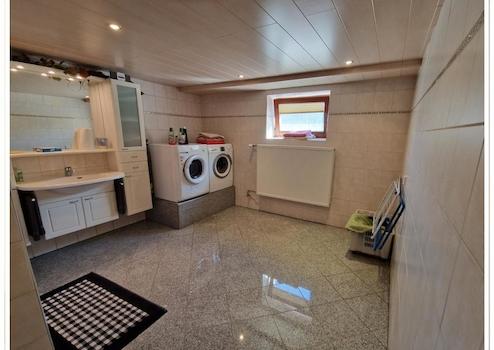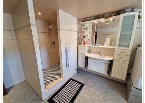 Neues Bad im Untergeschoss, mit Granitfliesen und begehbarer großer Dusche, sowie Platz für Waschmaschine, trockner und weitere Hauswirtschaft;