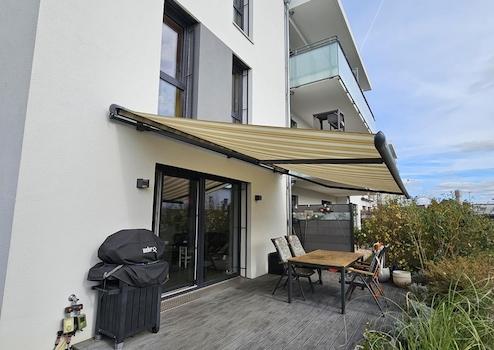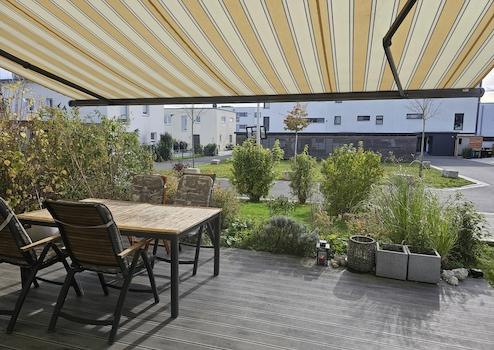 Die hochwertige Einbauküche mit Granitplatte und Bora-Kochfeld fügt sich harmonisch in das elegante Wohnambiente ein. Vom Wohnzimmer gelangen Sie direkt auf die 15 m² große Terrasse mit Südausrichtung und in den liebevoll angelegten 60 m² Garten. Eine elektrische Design-Markise erweitert den Wohnraum ins Grüne.