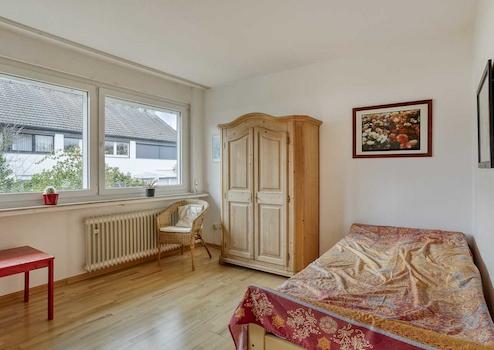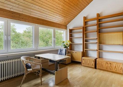- Fliesen im Eingangsbereich, der Küche und den Sanitärbereichen; Buchenparkett in der Diele, dem Wohnzimmer und den Schlafräumen; Textilboden bzw. Estrich im Untergeschoss