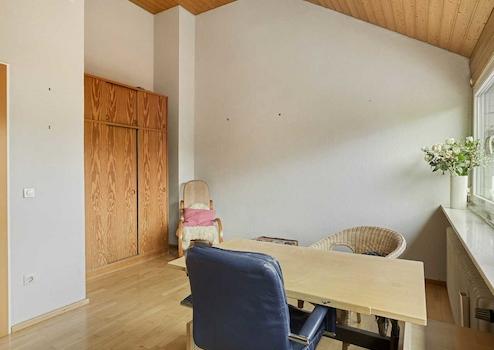 - Die Wandflächen sind größtenteils mit Raufasertapete versehen und hell (weiß/ teils blau) gestrichen; mit Holz verkleidete Deckenflächen im Dachgeschoss