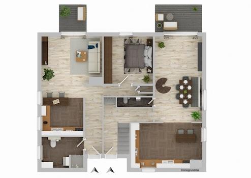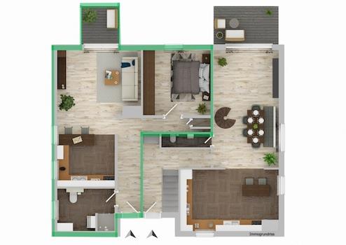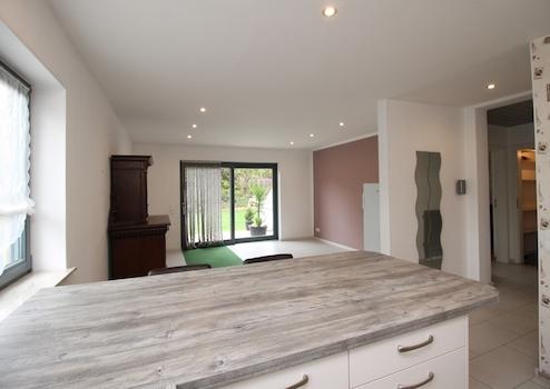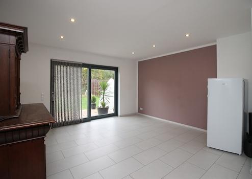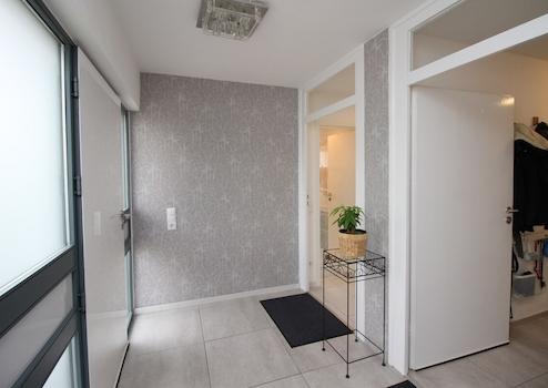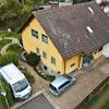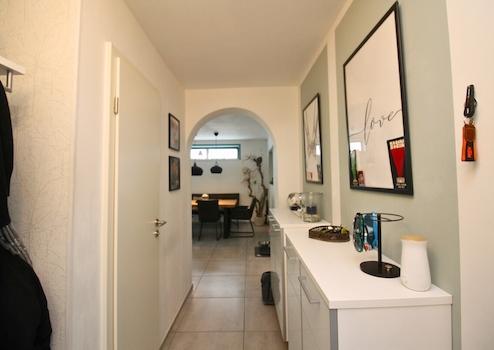 Beim Betreten des Hauses erwartet Sie im Erdgeschoss der separate Eingang zur ca. 60 m² großen Einliegerwohnung. Diese wurde 2020 modern saniert und überzeugt mit einem großzügigen Wohnbereich mit offener Küche, sowie einem hellen Schlafzimmer.