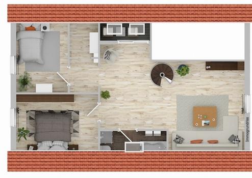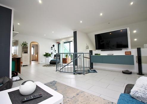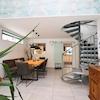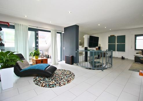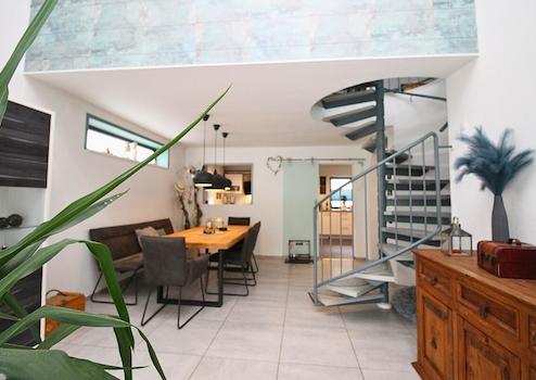 Über eine elegante Wendeltreppe gelangt man in das offene Wohnzimmer im Obergeschoss, das mit seiner Galerie-Optik ein besonderes Wohngefühl vermittelt. Zudem befinden sich hier zwei Schlafzimmer sowie ein schön geschlossener Balkon, der zum Entspannen einlädt.