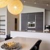 Im Essbereich finden Sie einen großen Esstisch sowie die grifflose Designküche mit Insel und allen Standard-Einbaugeräten (Geschirrspüler, Mikrowelle, Kühlschrank mit Gefrierfach, Induktionskochfeld) der Marke Bauknecht. Außerdem sind eine Kaffeemaschine, ein Wasserkocher und ein Toaster vorhanden.