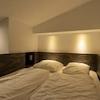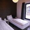 Das letzte Schlafzimmer liegt ebenfalls an der Vorderseite. Auch hier stehen zwei Einzelbetten, die sich zu einem Doppelbett verbinden lassen, mit Nachttisch und einer integrierten Schrankwand.